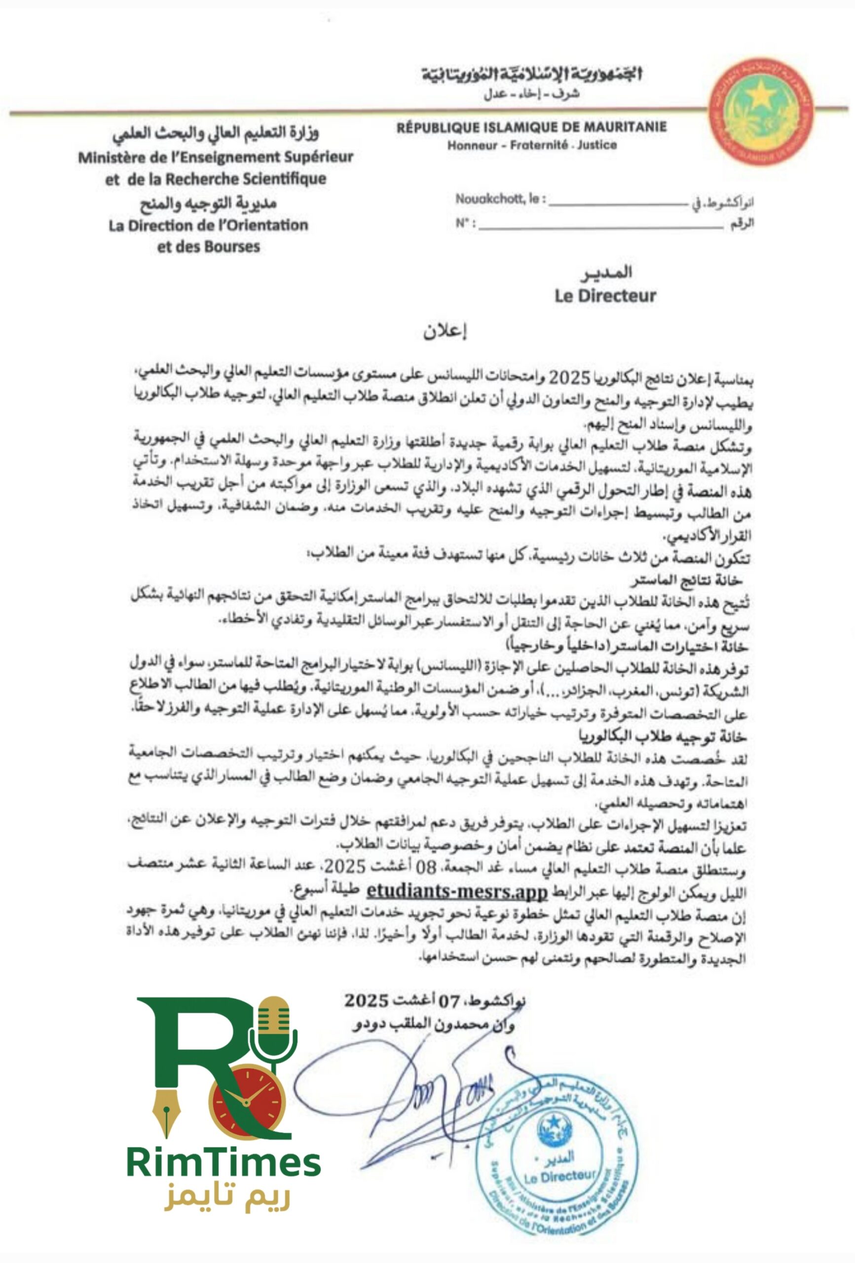 وفي إعلان صادر اليوم الخميس، أوضحت الإدارة أن هذه المنصة تشكل واجهة رقمية موحدة، تتيح للطلاب الاستفادة من خدمات أكاديمية وإدارية متنوعة بطريقة مبسطة وسلسة، مشيرة إلى أن إطلاق المنصة سيتم منتصف ليل الجمعة 08 أغسطس 2025، وستظل متاحة لمدة أسبوع كامل عبر الرابط: etudiants-mesrs.app.