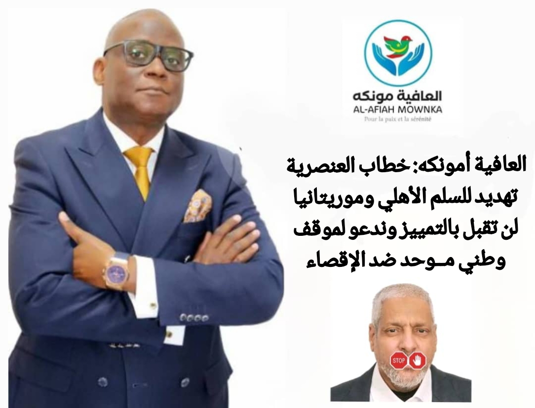 أصدر رئيس منظمة العافية أمونكه، الإطار الوطني البارز والخبير الدولي المعروف السيد أحمد ولد خطري، بلاغًا عاجلًا عبّر فيه عن رفض المنظمة القاطع للخطاب العنصري الذي أطلقه عبد الفتاح ولد اعبيدن، واصفًا إياه بأنه “خروج سافر على أخلاقيات المهنة الصحفية، وتحريض خطير على الكراهية والتمييز”.
