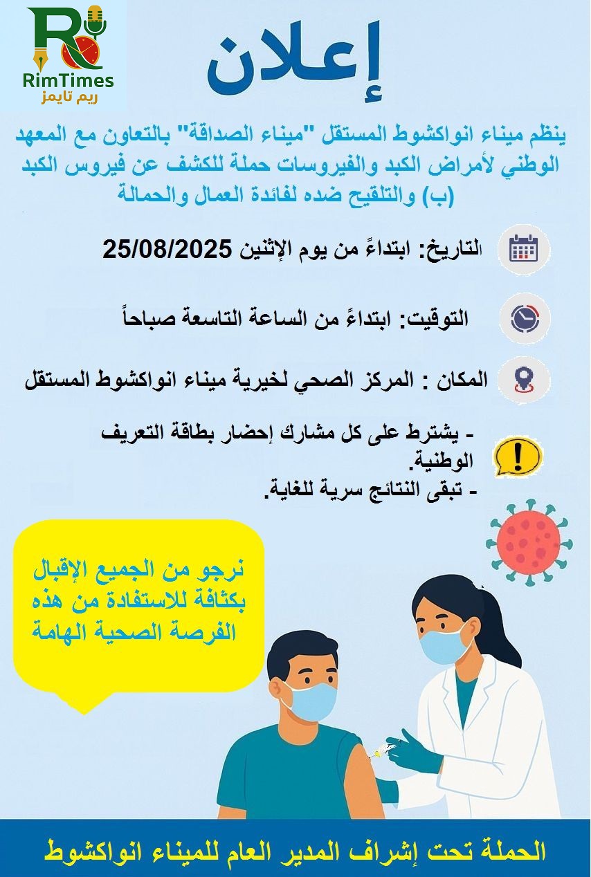 في خطوة تهدف إلى تعزيز صحة وسلامة عماله، أعلن ميناء نواكشوط المستقل “ميناء الصداقة” عن تنظيم حملة صحية للكشف والتلقيح ضد فيروس الكبد (ب)، وذلك يوم الاثنين المقبل في المركز الصحي التابع لخيرية الميناء، ابتداءً من الساعة التاسعة صباحًا.
