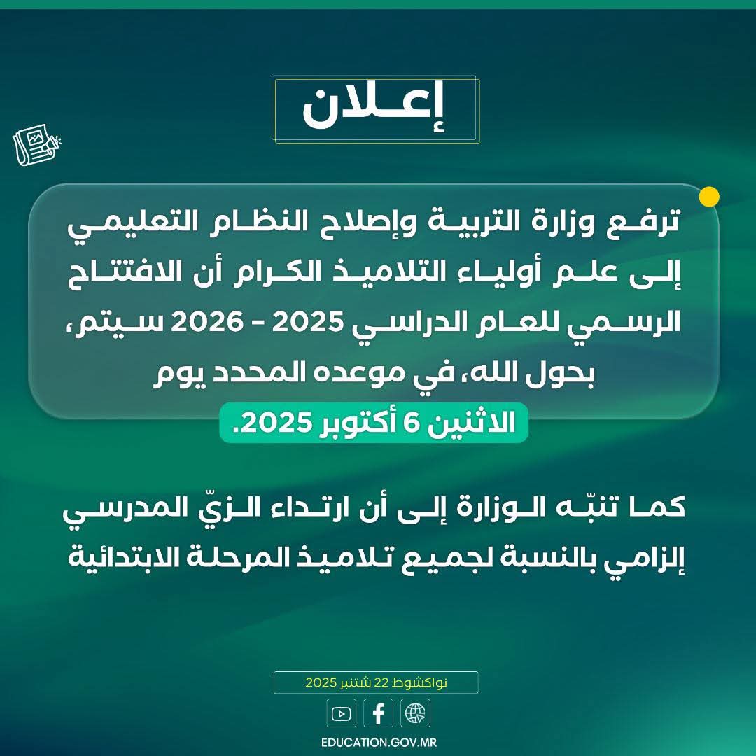 مع اقتراب موعد انطلاق العام الدراسي الجديد، شددت وزارة التربية وإصلاح النظام التعليمي في موريتانيا على أهمية ارتداء التلاميذ للزي المدرسي، مؤكدة إلزام أولياء الأمور بتوفير الزي لجميع أبنائهم في المرحلة الابتدائية.