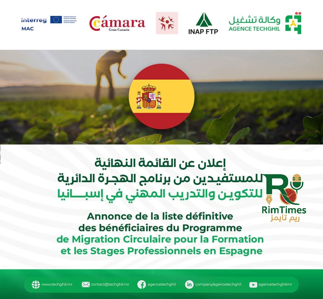 في إطار جهودها الرامية إلى خلق فرص جديدة للشباب الموريتاني وتعزيز قدراتهم المهنية، أعلنت الوكالة الوطنية للتشغيل (تشغيل) عن نشر القائمة النهائية للمستفيدين من برنامج الهجرة الدائرية للتكوين والتدريب المهني في إسبانيا.
