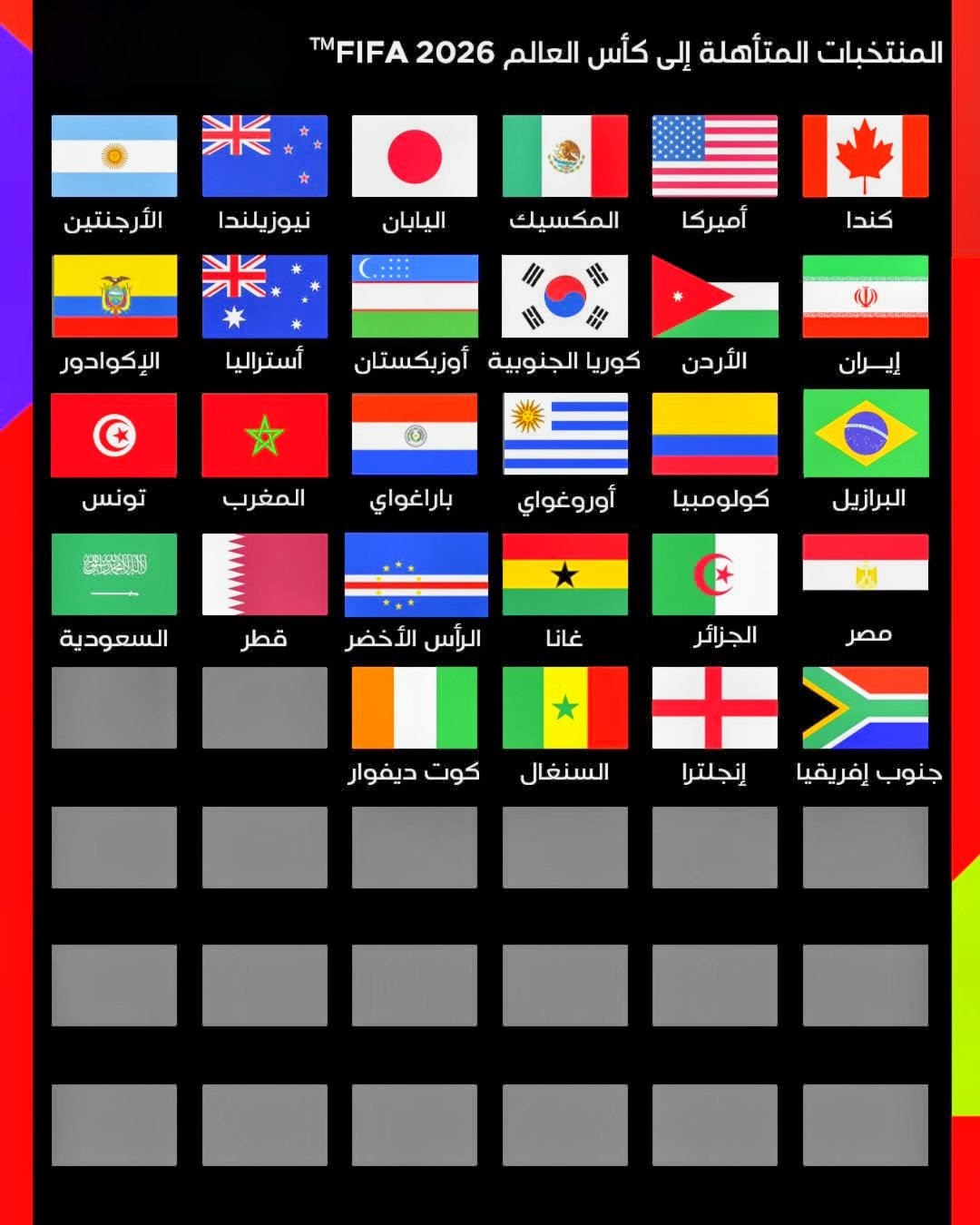 ومع استمرار التصفيات واقتراب اكتمال عقد المتأهلين، حجزت عدة منتخبات عربية مقاعدها في الحدث العالمي، في مقدمتها السعودية وقطر والمغرب وتونس والجزائر ومصر والأردن، لتسجل الكرة العربية حضورًا قياسيًا بـ7 منتخبات.
