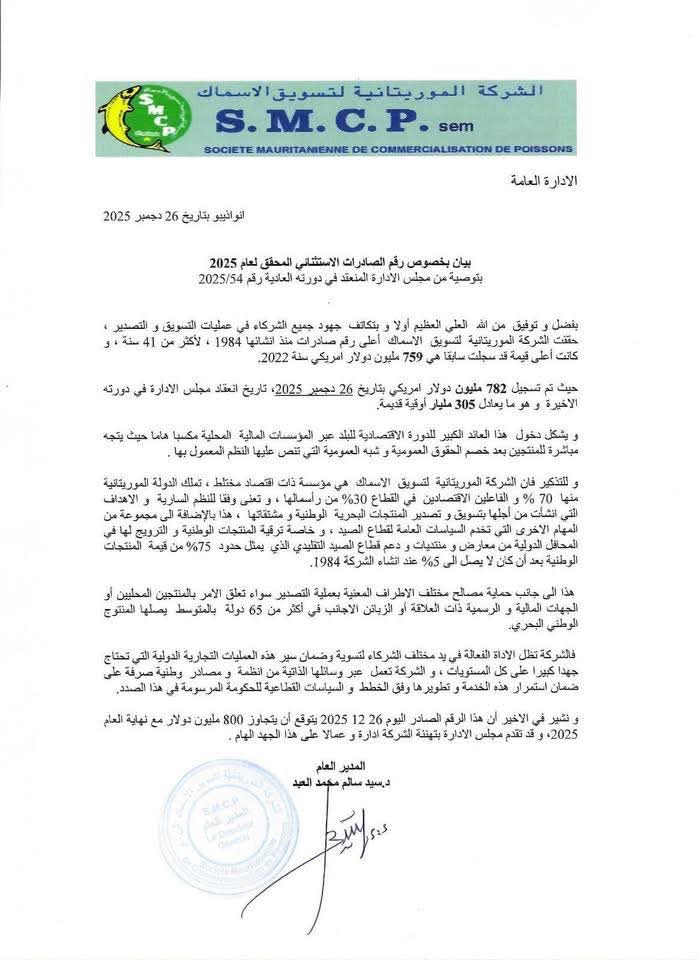 ويأتي هذا الأداء الاستثنائي تنفيذًا لتوصيات مجلس إدارة الشركة خلال دورته العادية، متجاوزًا الرقم القياسي السابق المسجّل سنة 2022، والذي بلغ 759 مليون دولار، ما يعكس تحسنًا ملحوظًا في أداء الشركة وتوسع حضور المنتجات السمكية الموريتانية في الأسواق العالمية.