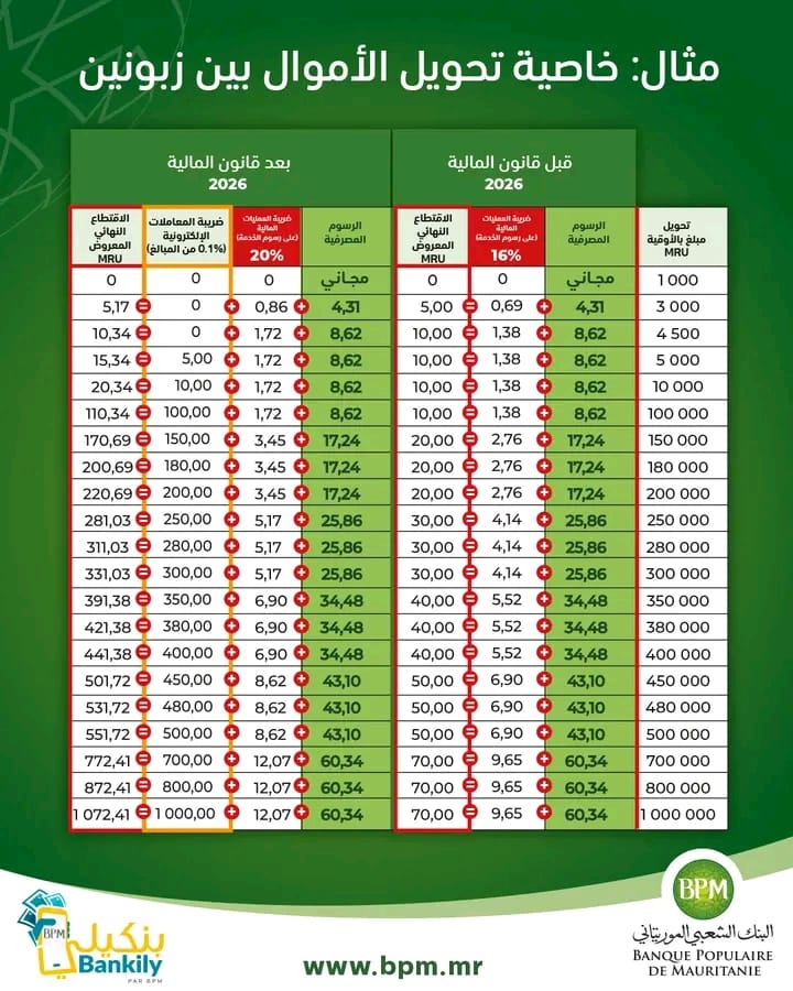 أكد البنك أن الضريبة على المعاملات الإلكترونية تُطبق على عمليات التحويل التي تبلغ 5000 أوقية جديدة أو أكثر، وذلك وفقًا للإجراءات الضريبية المعتمدة، والتي تستهدف تنظيم المعاملات الرقمية ومواكبة توسع استخدامها.