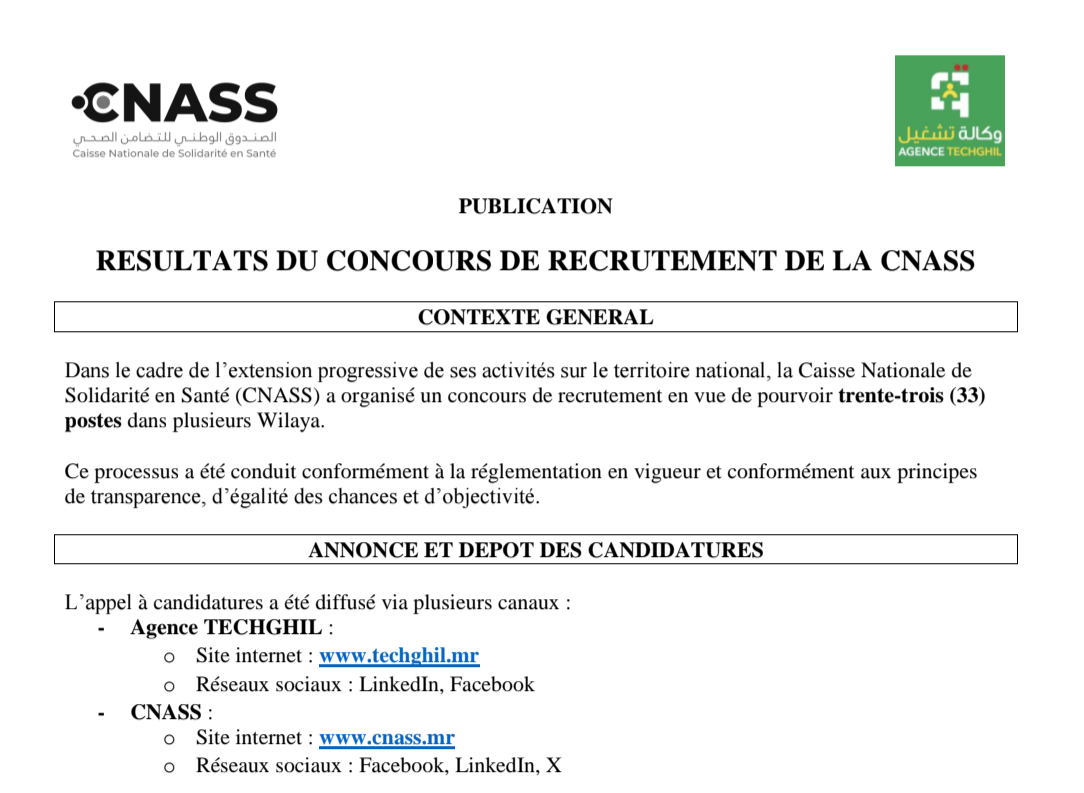 في خطوة تهدف إلى تعزيز موارده البشرية وتحسين جودة خدماته، أعلن الصندوق الوطني للتضامن الصحي (CNASS)، اليوم الثلاثاء، عن النتائج النهائية لاكتتاب وكلاء ومسؤولي انتساب، ونقاط اتصال، ومديري شبابيك، وذلك بعد استكمال مراحل الانتقاء وفق المعايير المعتمدة.