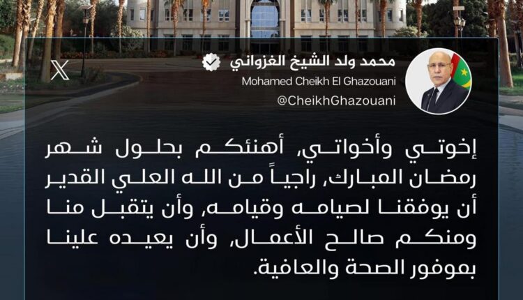 وكتب فخامته عبر منصة «إكس» رسالة تهنئة خاطب فيها المواطنين، مستحضرًا ما يحمله هذا الشهر الفضيل من معاني الرحمة والتكافل والتقرب إلى الله، ومؤكدًا حرصه على مشاركة الشعب هذه المناسبة الدينية العظيمة التي تحظى بمكانة خاصة في وجدان الموريتانيين.