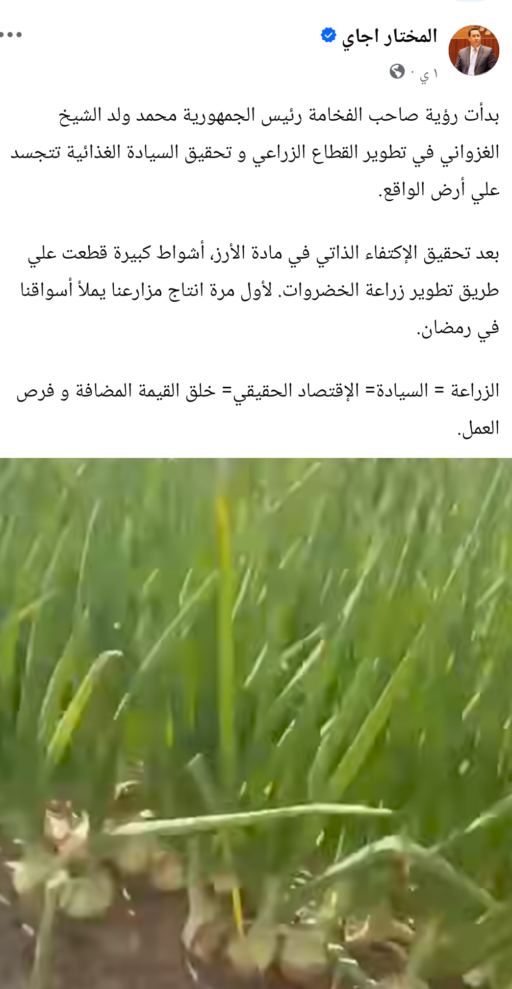 وأشار ولد أجاي إلى أن رؤية رئيس الجمهورية محمد ولد الشيخ الغزواني، القائمة على تطوير القطاع الزراعي وتحقيق السيادة الغذائية، بدأت تؤتي ثمارها بشكل ملموس، مؤكدا أن الدولة ماضية في تعزيز البنى التحتية الزراعية، وتوفير المدخلات الضرورية، ودعم سلاسل الإنتاج والتسويق.
