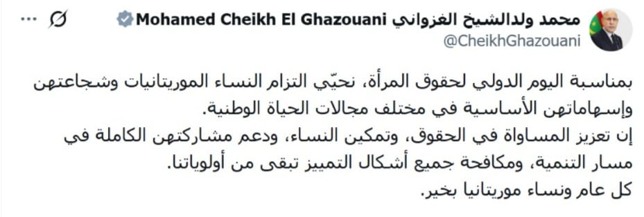 وأكد الرئيس غزواني، في تغريدة نشرها على حسابه في منصة “أكس” (تويتر سابقًا)، أن المرأة الموريتانية تواصل لعب دور محوري في مختلف مجالات الحياة الوطنية، مشيرًا إلى أن إسهاماتها كانت ولا تزال ركيزة أساسية في مسيرة التنمية والتقدم التي تشهدها البلاد.