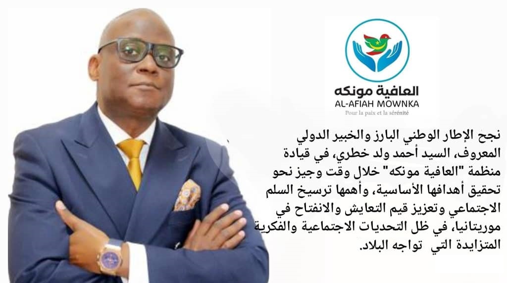 نجح الإطار الوطني البارز والخبير الدولي المعروف، السيد أحمد ولد خطري، في قيادة منظمة “العافية مونكه” خلال وقت وجيز نحو تحقيق أهدافها الأساسية، وأهمها ترسيخ السلم الاجتماعي وتعزيز قيم التعايش والانفتاح في موريتانيا، في ظل التحديات الاجتماعية والفكرية المتزايدة التي تواجه البلاد.
