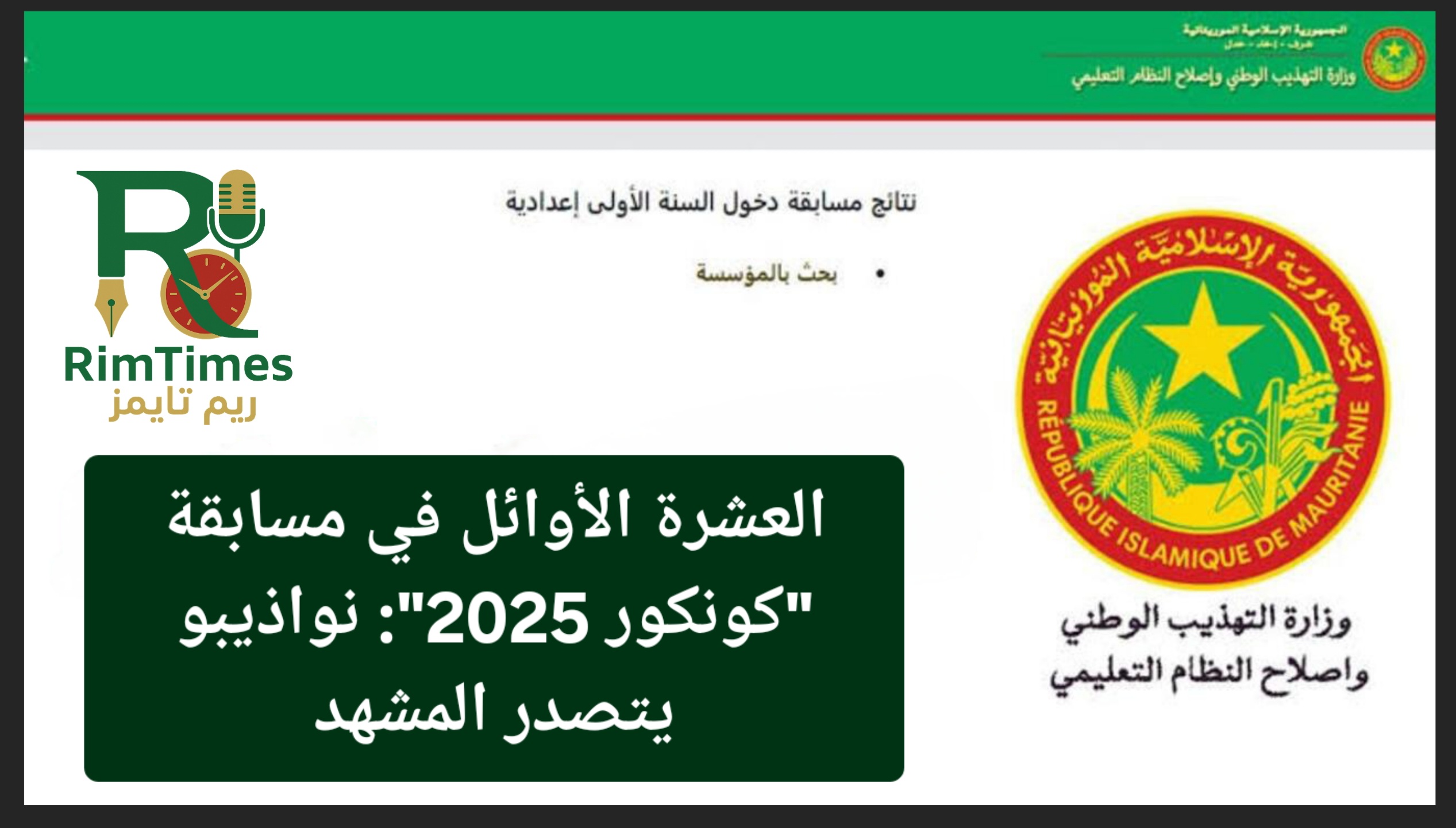 أظهرت نتائج مسابقة دخول السنة الأولى إعدادية (كونكور) للعام الدراسي 2024 – 2025 تفوق تلاميذ مدينة نواذيبو، حيث حصلوا على أعلى المراتب ضمن قائمة العشرة الأوائل، إلى جانب مشاركات متميزة من تلاميذ نواكشوط الشمالية.
