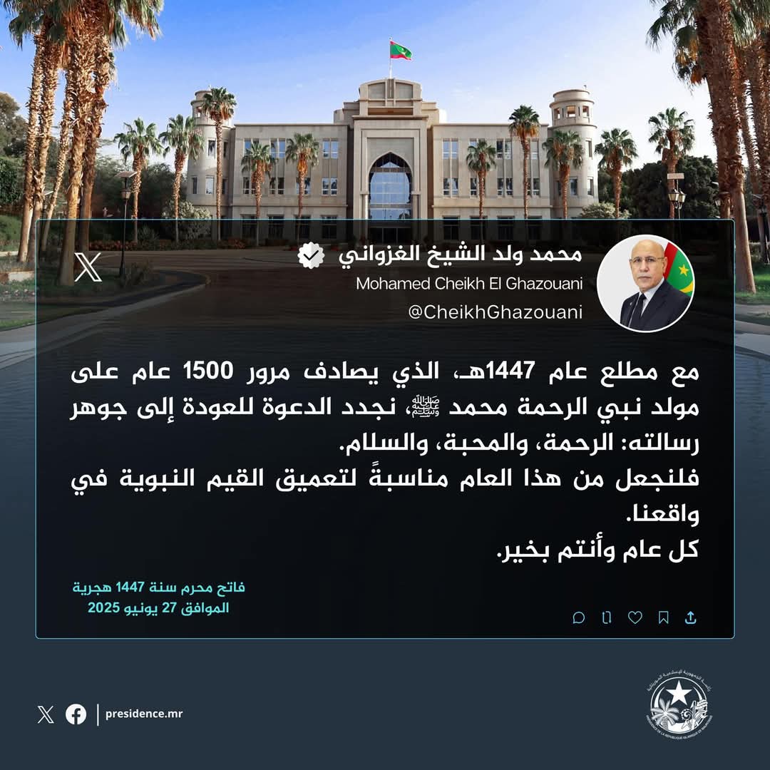دعا رئيس الجمهورية، محمد ولد الشيخ الغزواني، إلى التمسك بجوهر رسالة النبي صلى الله عليه وسلم المتمثلة في الرحمة، والمحبة، والسلام.