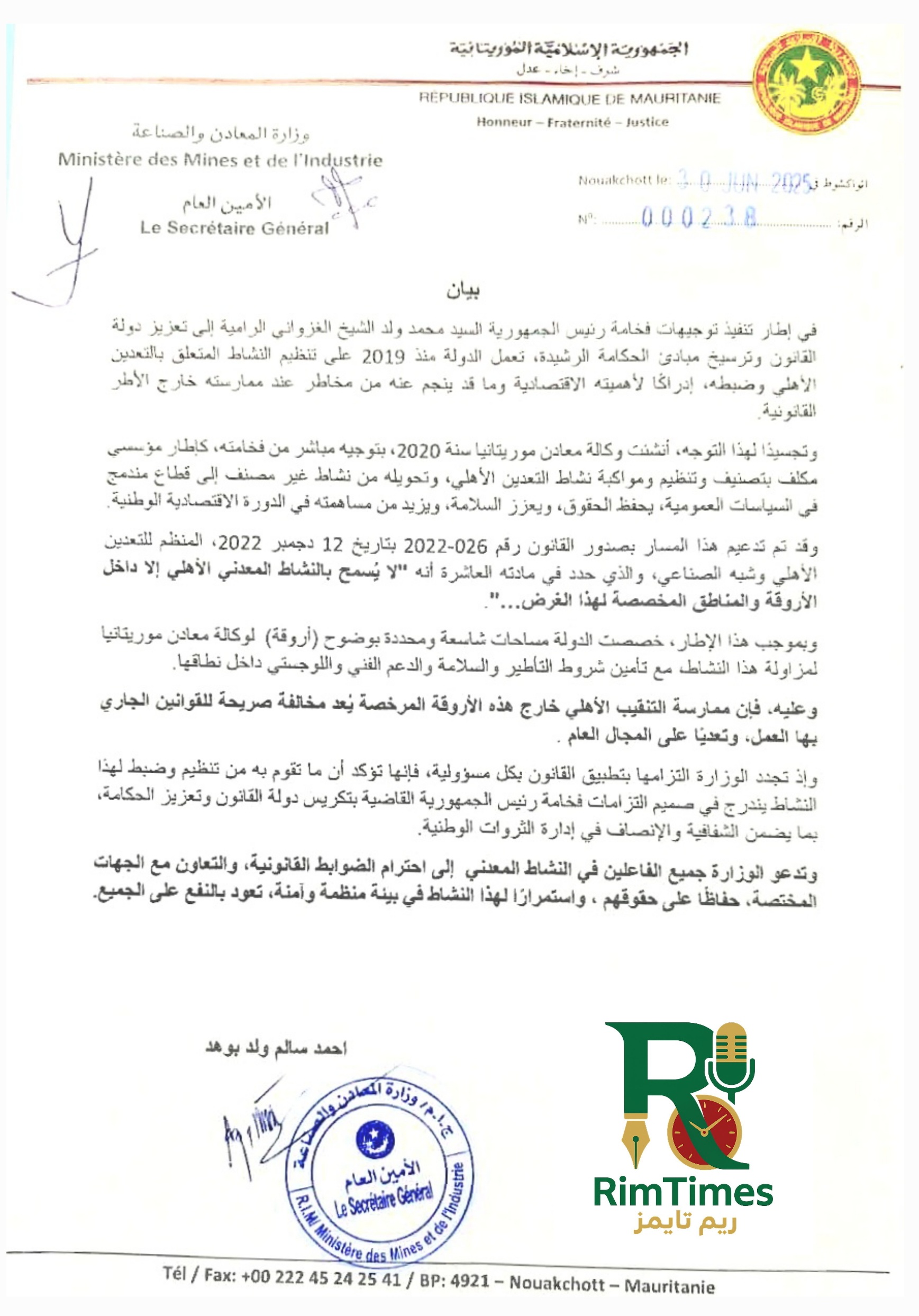 دعت وزارة المعادن والصناعة كافة الفاعلين في مجال التنقيب الأهلي إلى الالتزام الصارم بالأطر القانونية، محذرة من ممارسة أي نشاط تنقيبي خارج المناطق المرخصة من طرف وكالة معادن موريتانيا.