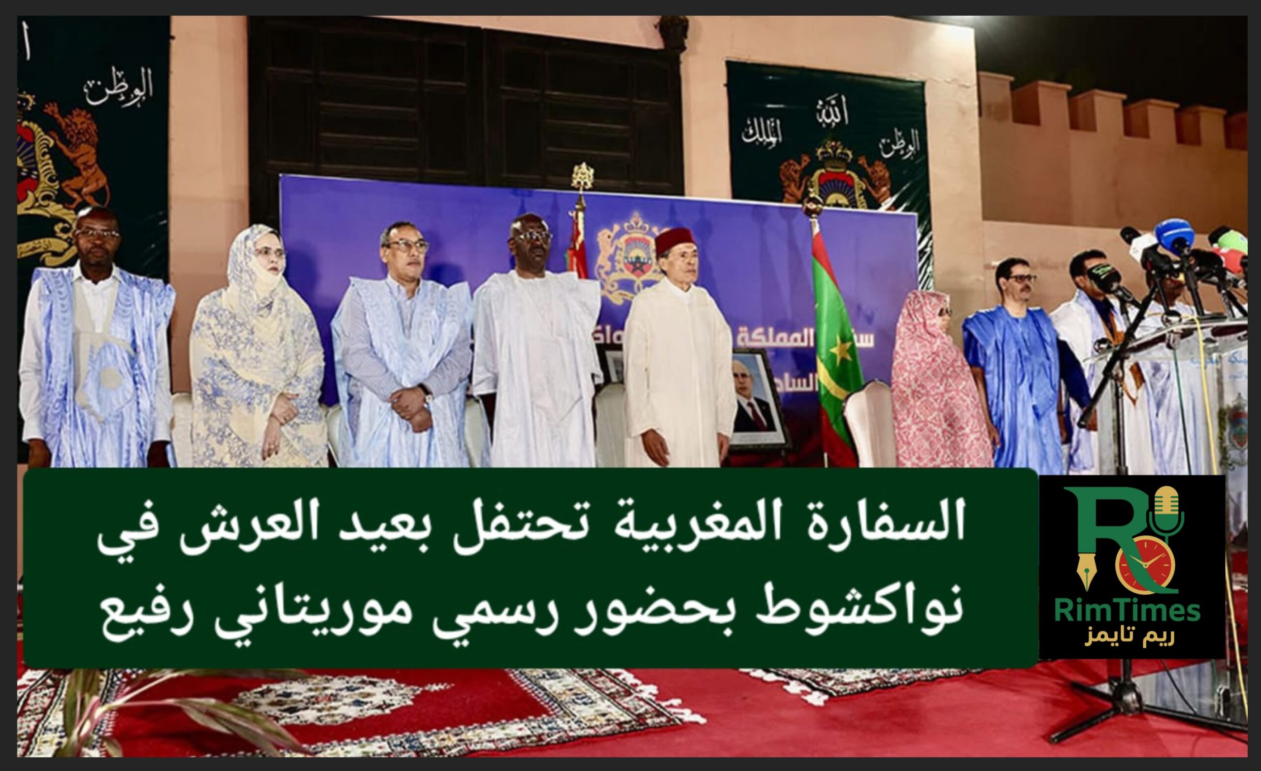 في أجواء طغت عليها روح الأخوة المغاربية، نظّمت السفارة المغربية في نواكشوط، مساء أمس، حفل استقبال رسمي بمناسبة الذكرى السادسة والعشرين لعيد العرش، الذي يصادف تولي العاهل المغربي الملك محمد السادس مقاليد الحكم. وقد حضر الحفل عدد من أعضاء الحكومة الموريتانية، من بينهم وزير الشؤون الخارجية السيد محمد سالم ولد مرزوك، ووزيرة التجارة والسياحة السيدة زينب بنت أحمدناه، ووزير التعليم العالي السيد محمد الأمين سيدنا أعمر، إلى جانب مسؤولين من رئاسة الجمهورية والوزارة الأولى، وسفراء ودبلوماسيين وممثلين عن الجالية المغربية المقيمة بموريتانيا.
